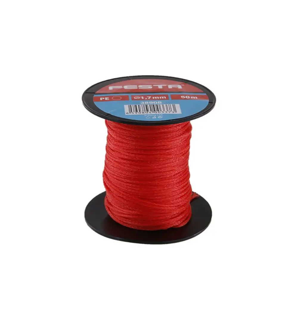A FESTA kőműveszsinór piros, 1.7 mm átmérőjű, 50 m hosszú tekercs, polietilén anyagból készült. Vízálló és kiváló szakítószilárdsággal rendelkezik, ideális építkezési, háztartási és kerti használatra.
