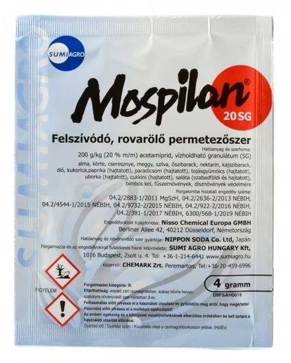 Rendkívül hatékony rovarölő permetezőszer - Mospilan 20 SG. Ez a rovarölő szer gyors hatást és hosszan tartó, akár 14 napig tartó védelmet nyújt a növény számára. Az acetamiprid és a metacetamidin hatóanyagai a leveleken és a gyökereken keresztül szívódnak fel a növényekben, kontakt és felszívodó hatást egyaránt biztosítva a kártevők gyors elpusztítására, miközben tartós védelmet is nyújtanak.