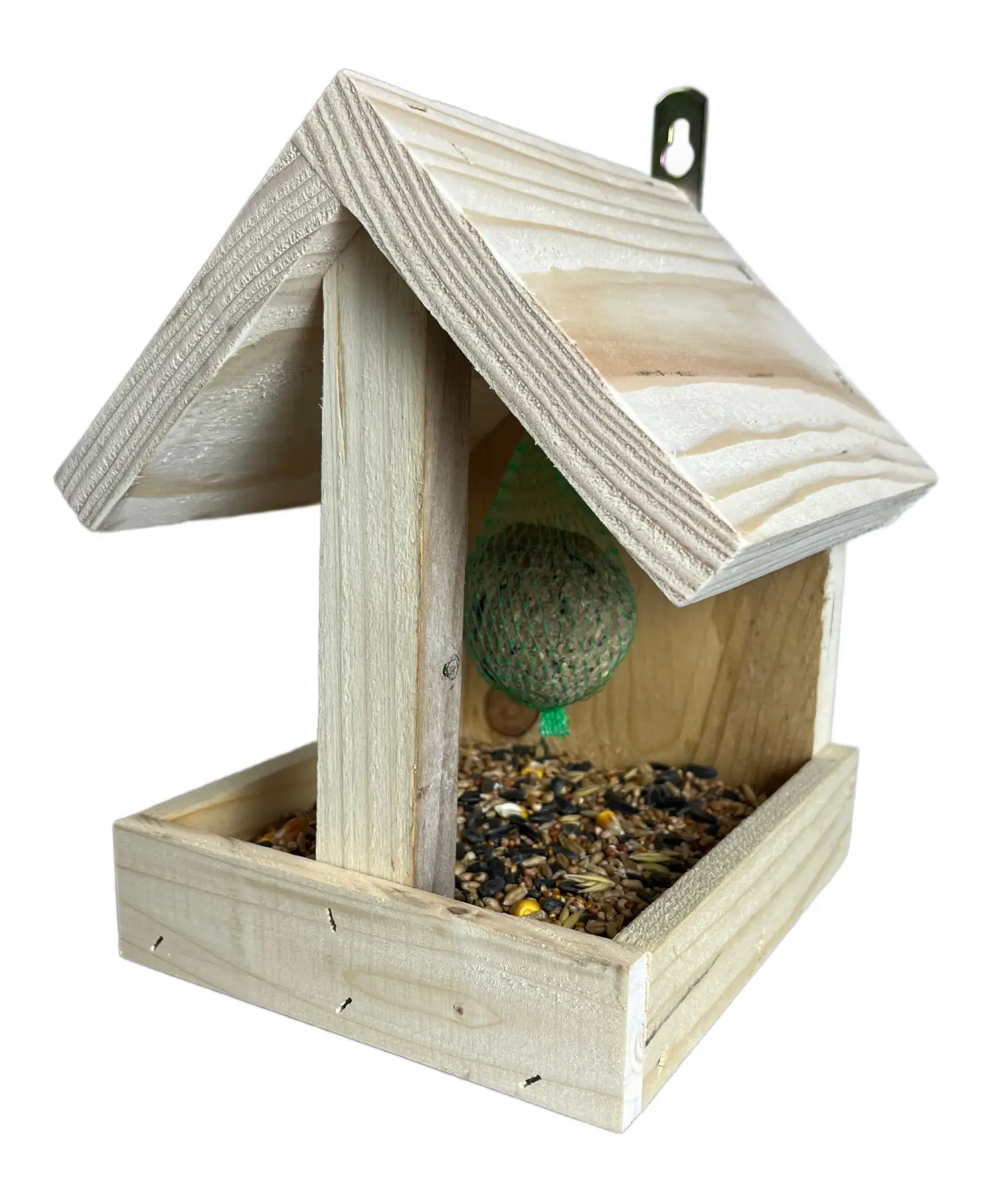 Az natúr fenyőből készült madáretető egyszerre dísz és praktikus etető a kertben vagy az erkélyen. A tetős kialakítás megóvja az eleséget a csapadéktól, az akasztófül pedig kényelmes megoldás a madárgolyók felakasztásához. A nyitott etetőtálca könnyű utántöltést és tisztítást biztosít.