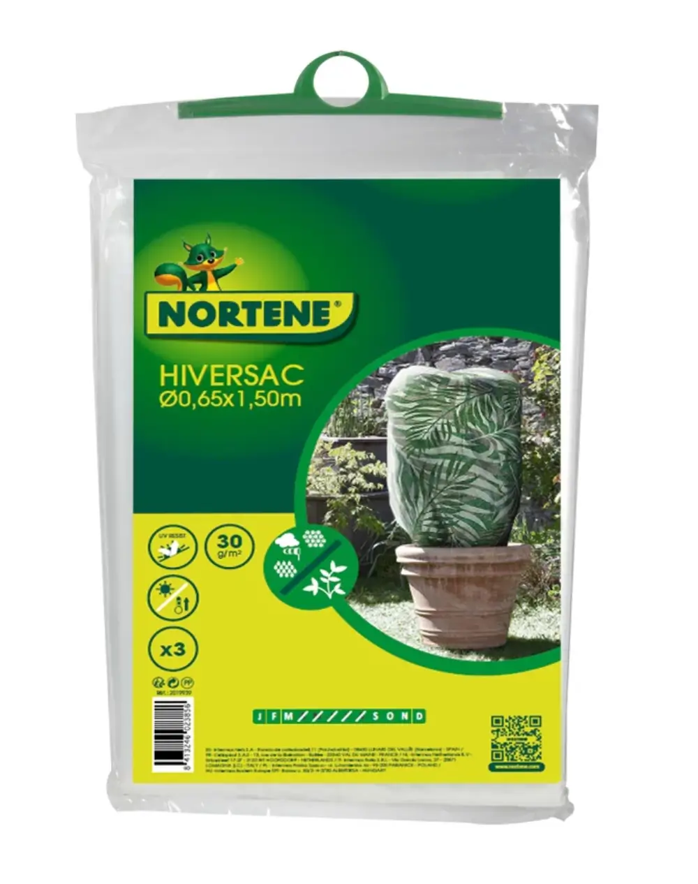 A Nortene Hiversac Deco levél mintás átteleltető növénytakaró védelmet biztosít növényei számára télen. Lég- és vízáteresztő, UV-álló anyaga több szezonon át használható.