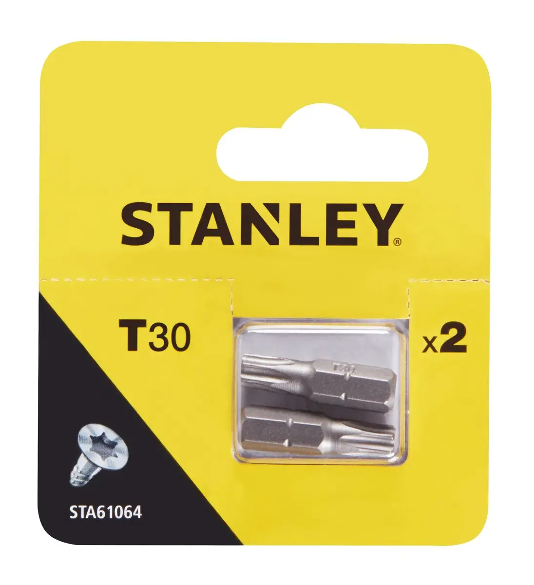 A STANLEY 25 mm-es T30 behajtótüske készlet két darab T30 típusú Torx bitet tartalmaz, amelyek a következő jellemzőkkel rendelkeznek: