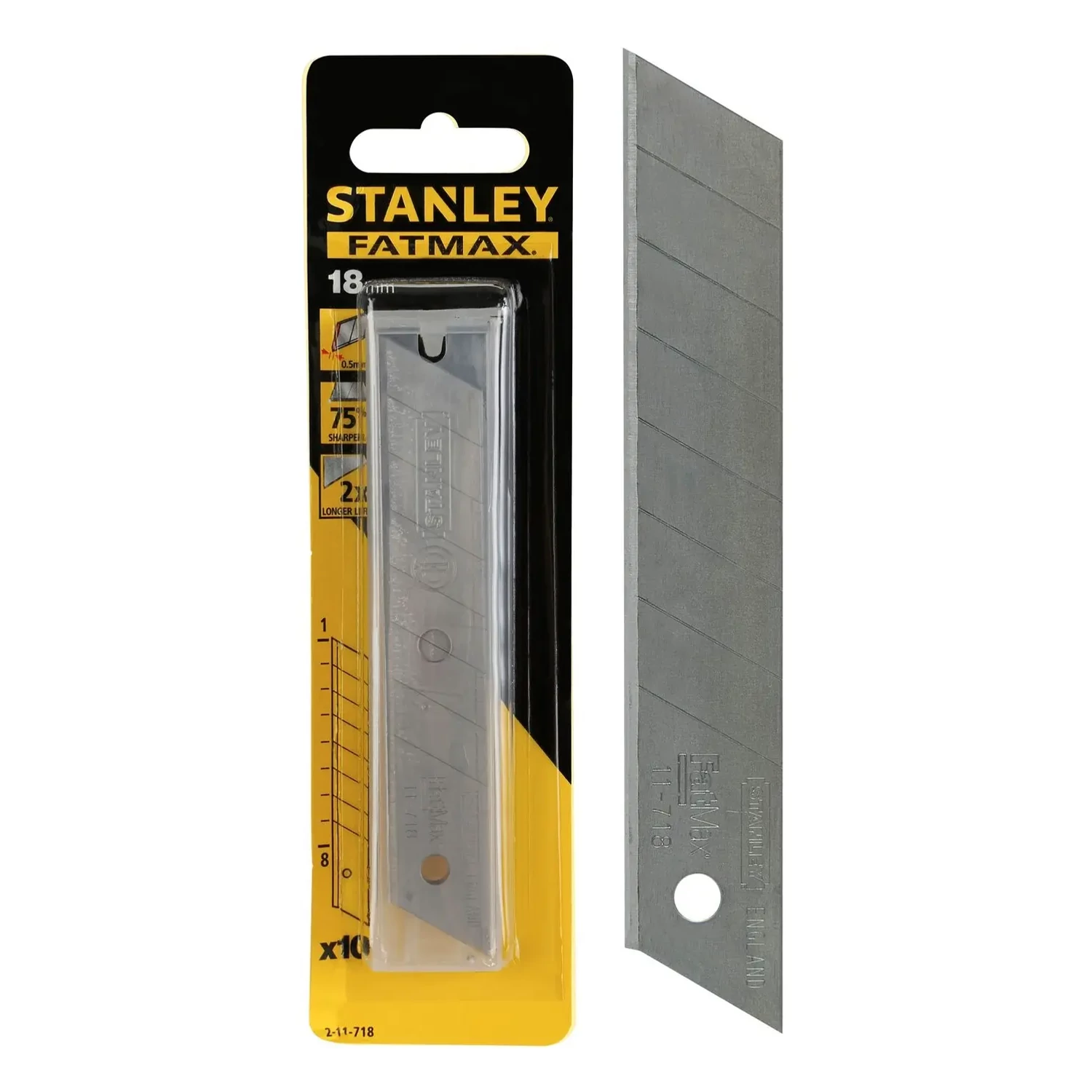 A STANLEY FATMAX 18mm-es törhető pengék (10db) wolfram-karbid bevonattal rendelkeznek, amely akár 10-szer hosszabb élettartamot biztosít a hagyományos pengékhez képest. A 8 szegmensre osztott kialakítás lehetővé teszi a penge gyors és egyszerű frissítését, így mindig éles vágóél áll rendelkezésre.