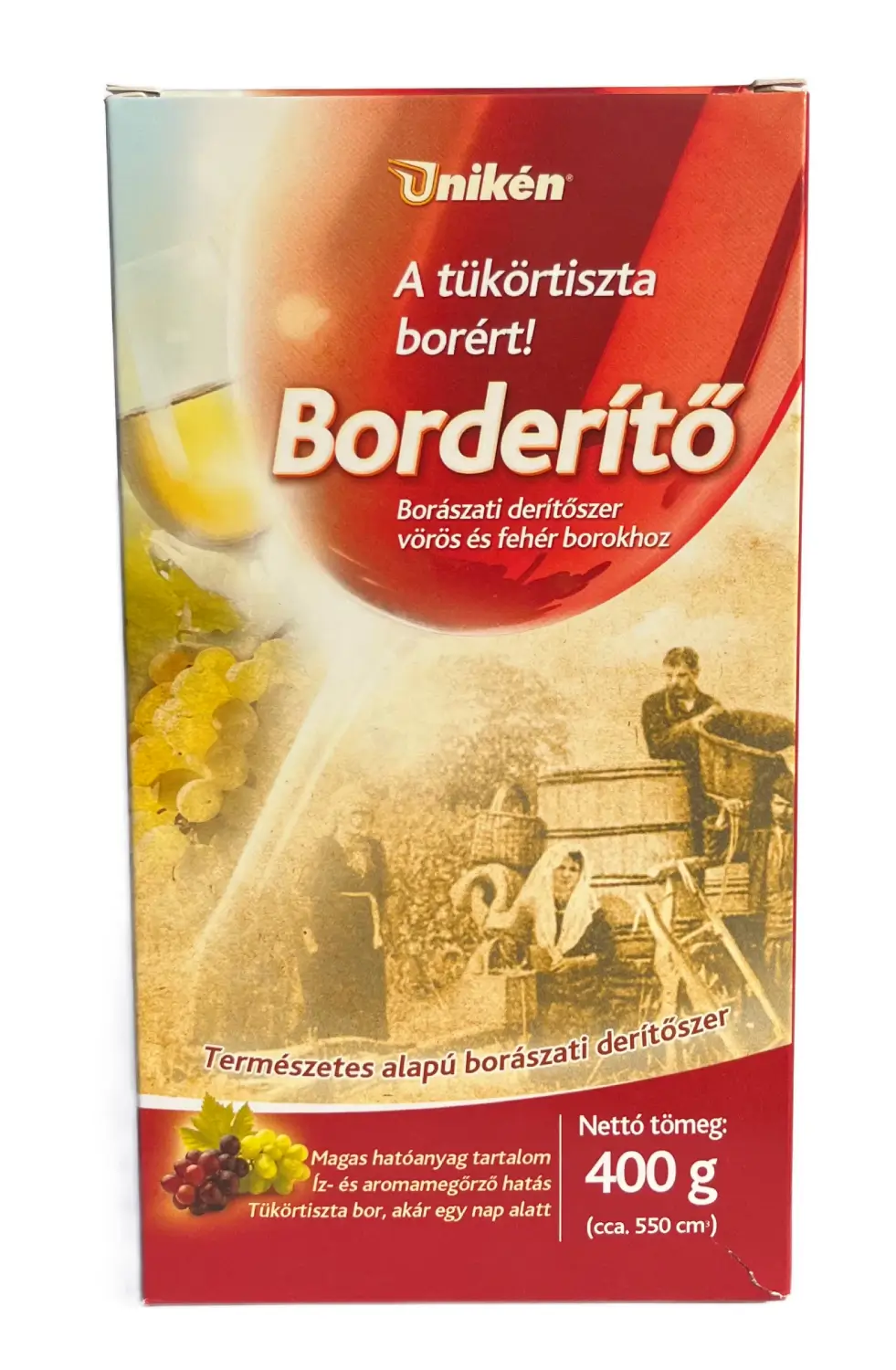Az Unikén természetes borderítő 400g-os kiszerelésben kapható, amely körülbelül 4-500 liter bor tisztítására elegendő. Hatékony megoldás mind vörös, mind fehér borok tisztítására, amely gazdaságos és megbízható eredményeket biztosít minden borásznak.