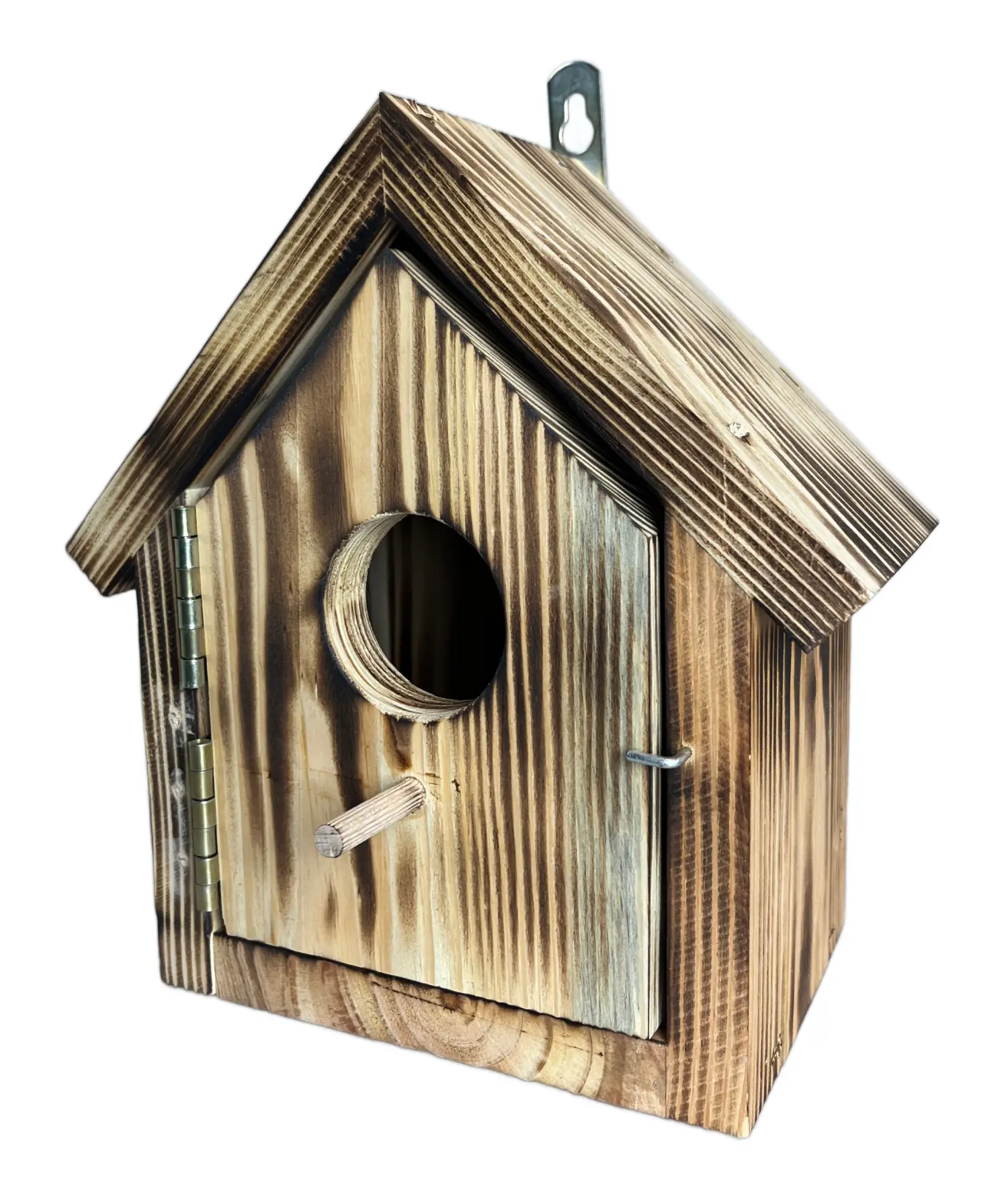 Égetett fenyőfa madáretető/madárház rusztikus megjelenéssel. A zárt, tetős kialakítás óvja az eleséget, a beépített akasztó pedig felakasztható madárgolyó rögzítésére is alkalmas. A felszereléshez szükséges 5×50 mm-es facsavar és kampó mellékelve.
